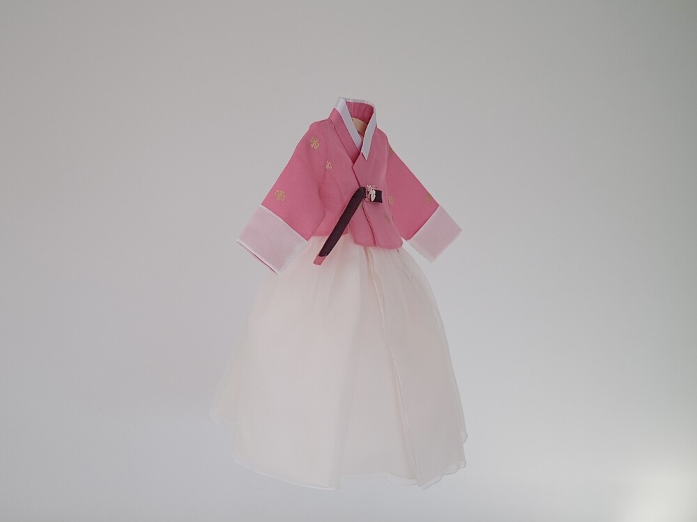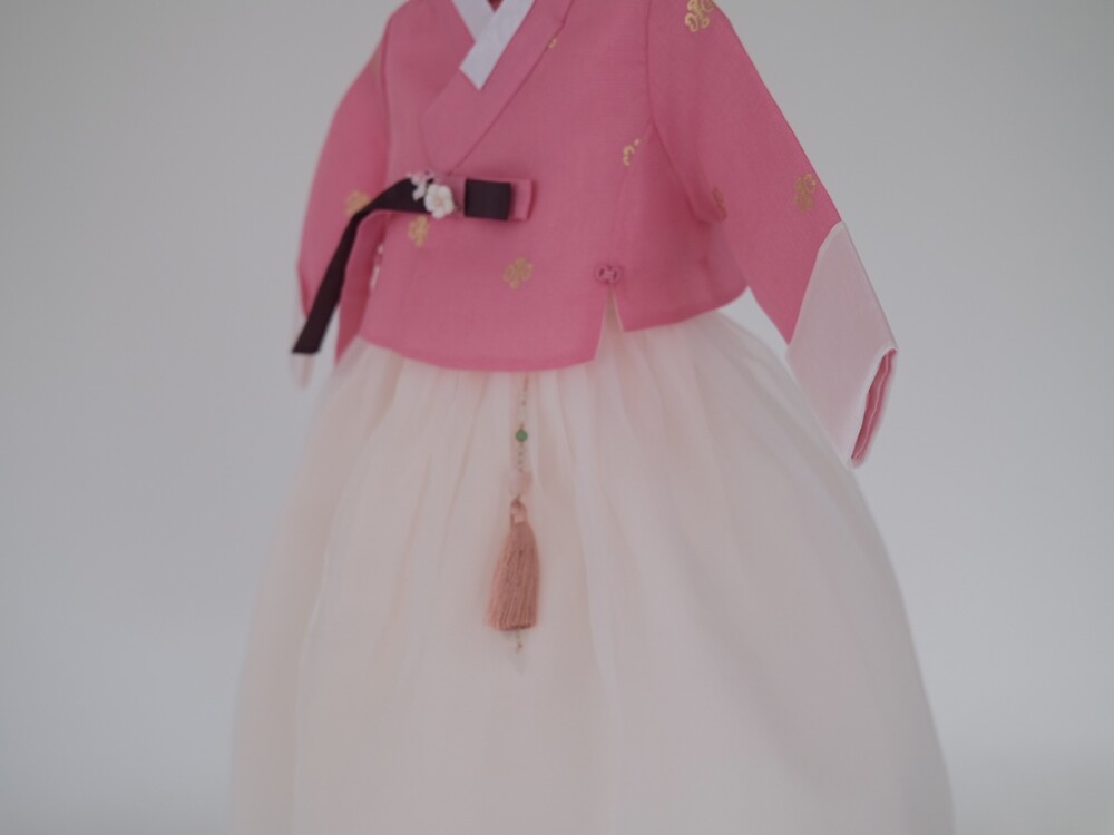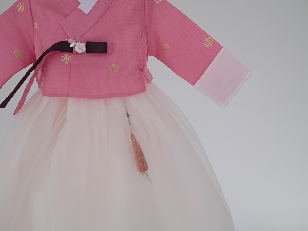 금박이 박힌 핫핑크빛 저고리에 아이보리빛 치마가 매치된 한복입니다.