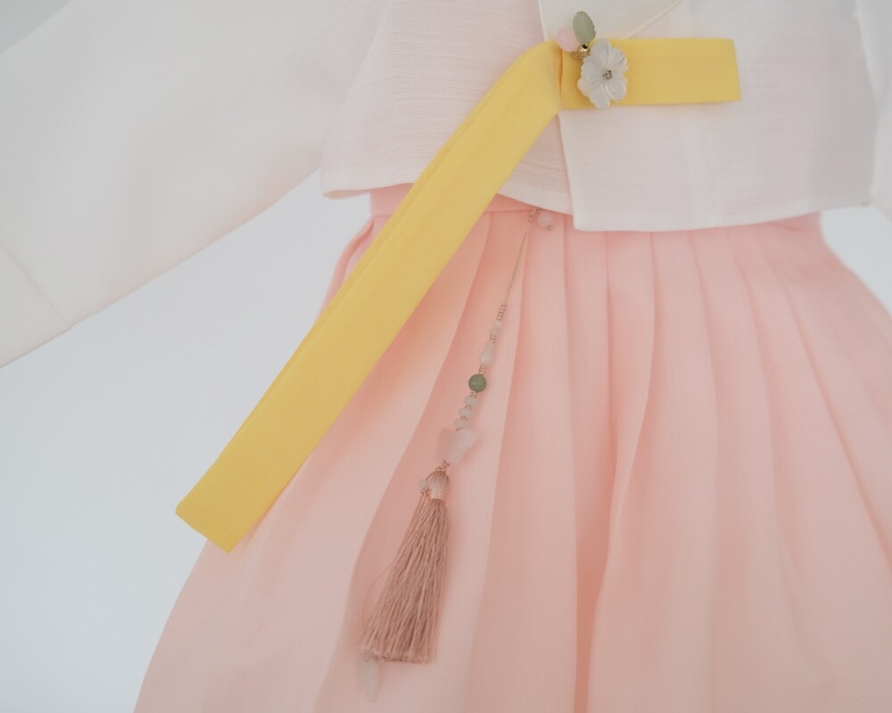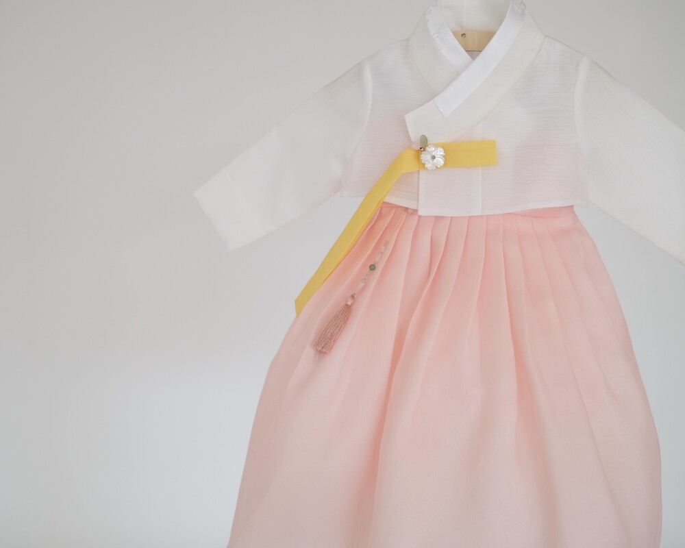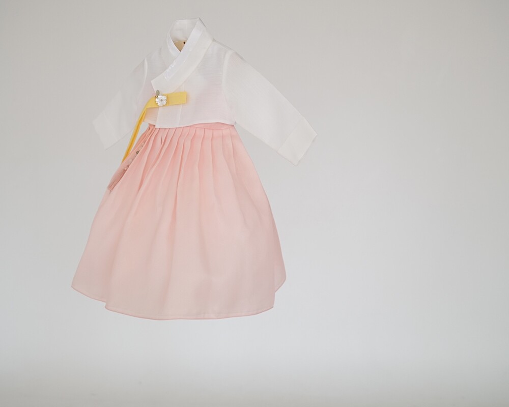 흰저고리가 깨끗한 느낌을 주면서 고름에 노랑컬러가 포인트로,