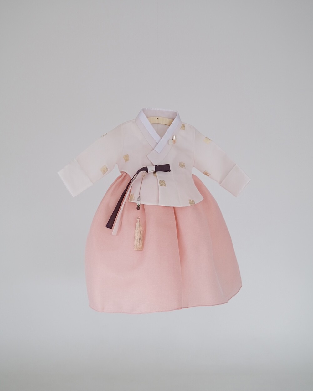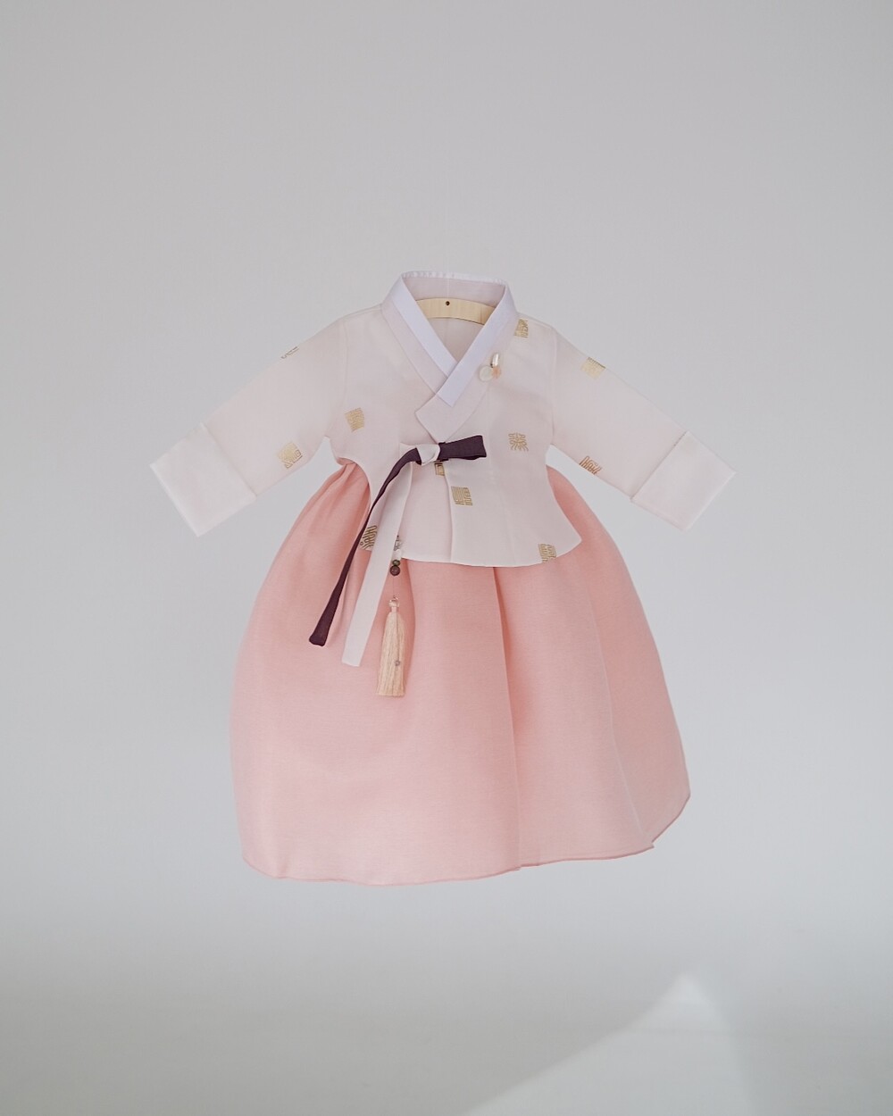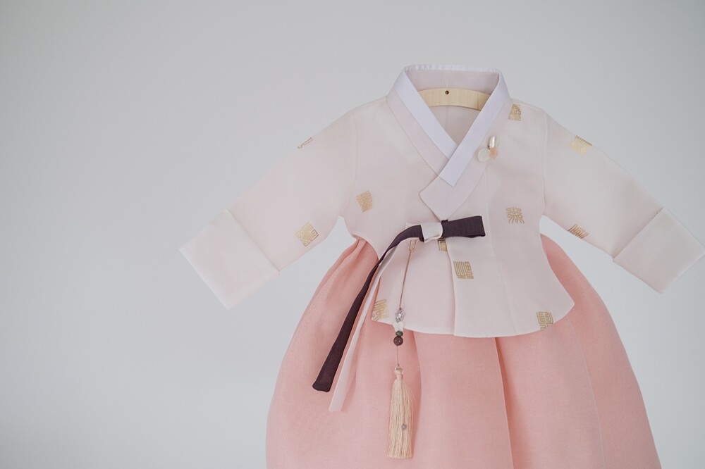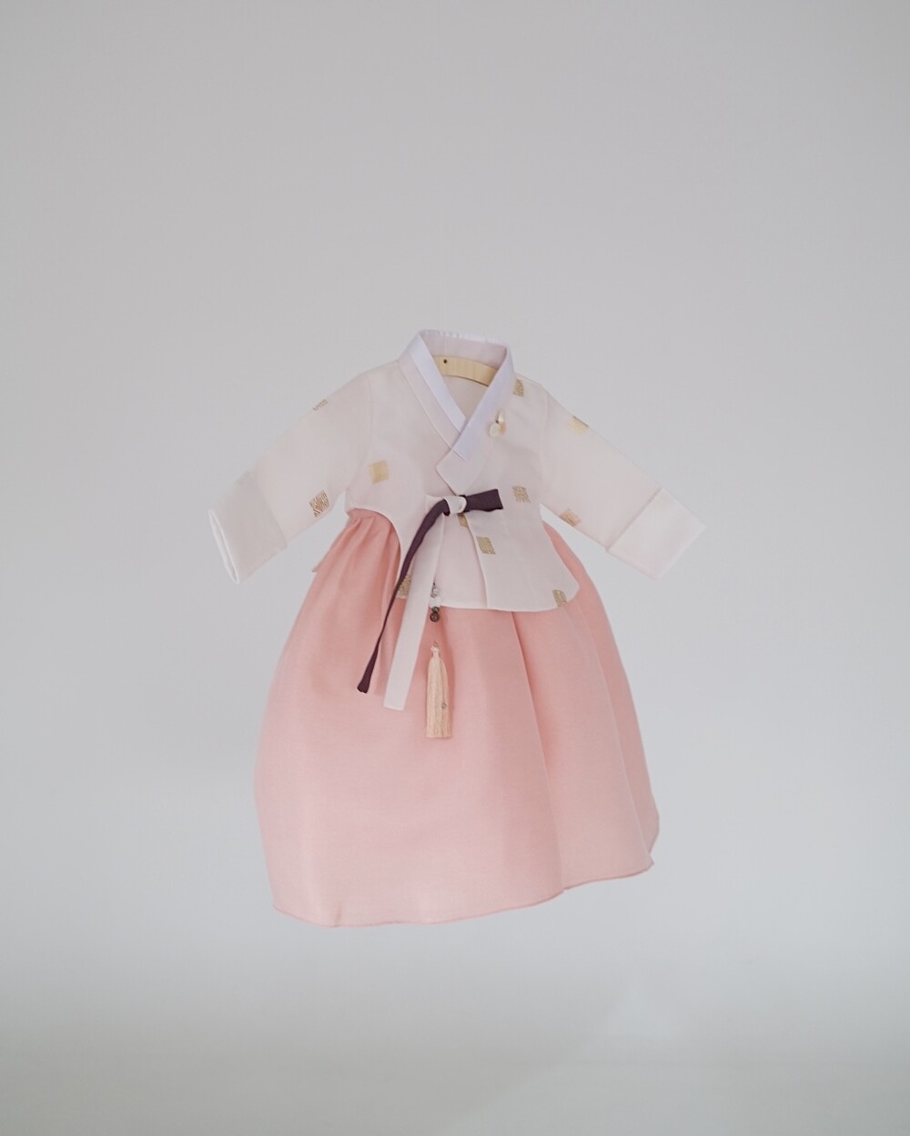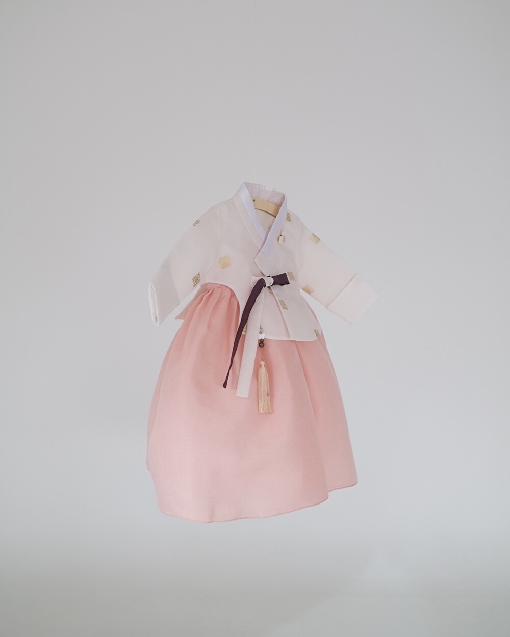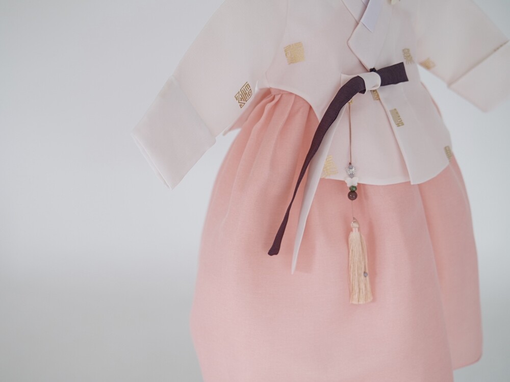 아이보리빛 저고리와 살구색 치마가 매치된 한복입니다.