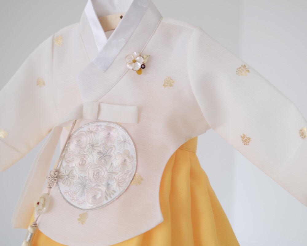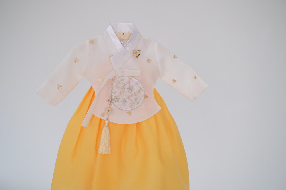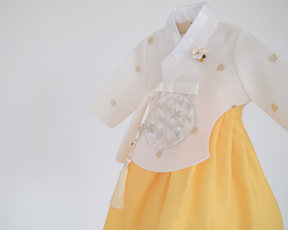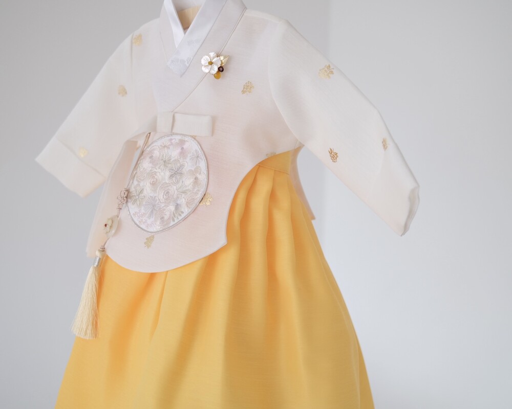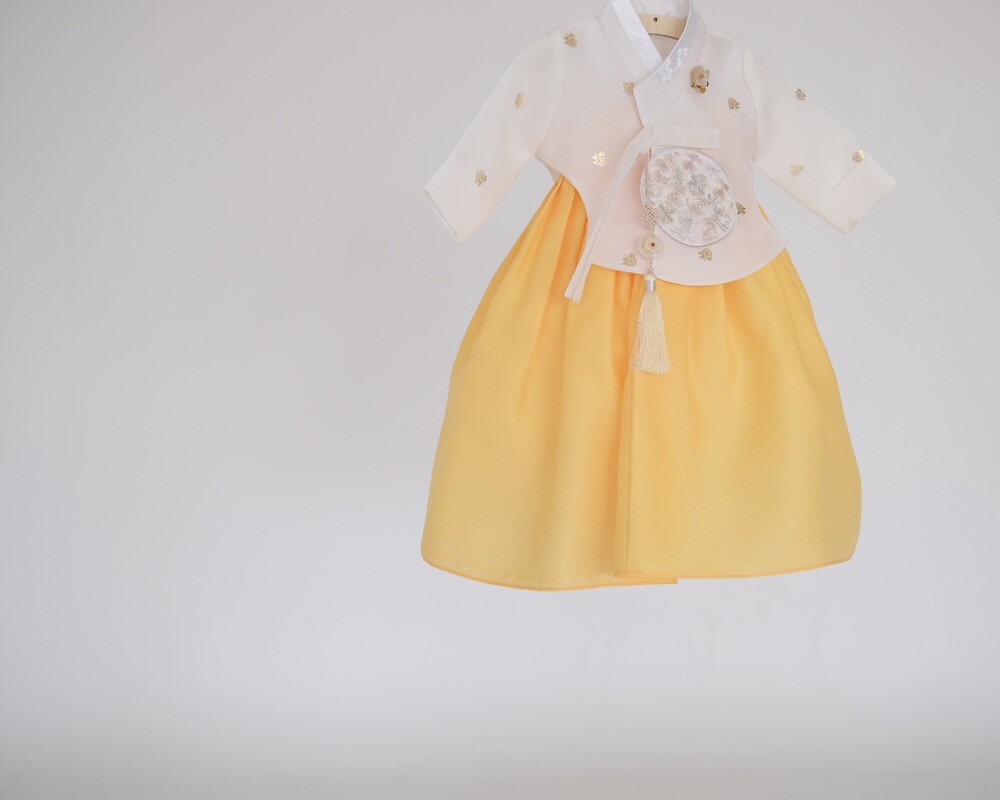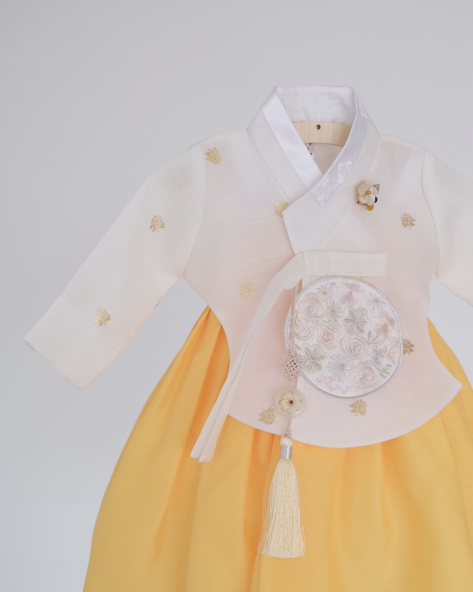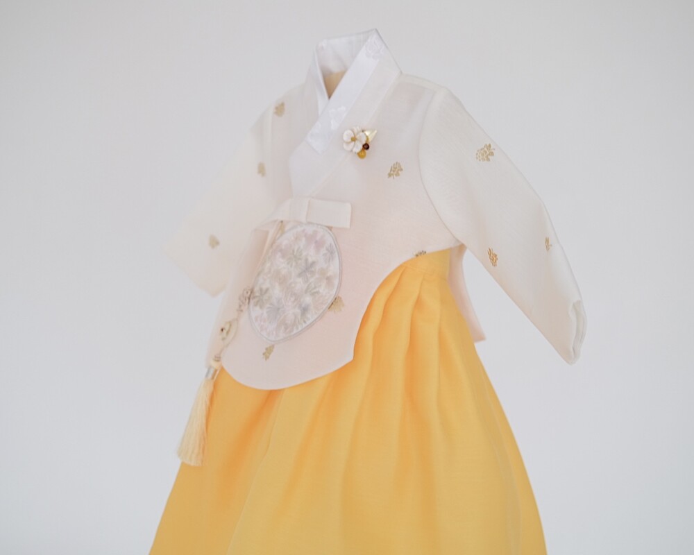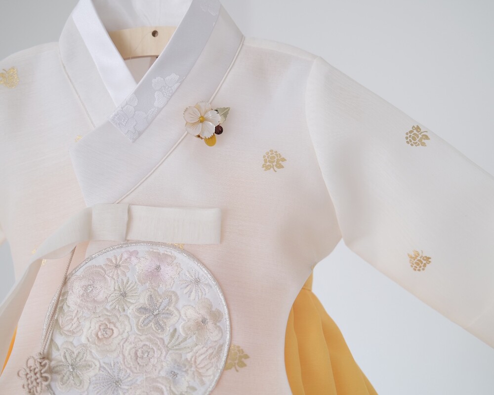 금박이 있는 흰 당의에 개나리가 연상되는 노랑치마로 구성된 한복입니다.