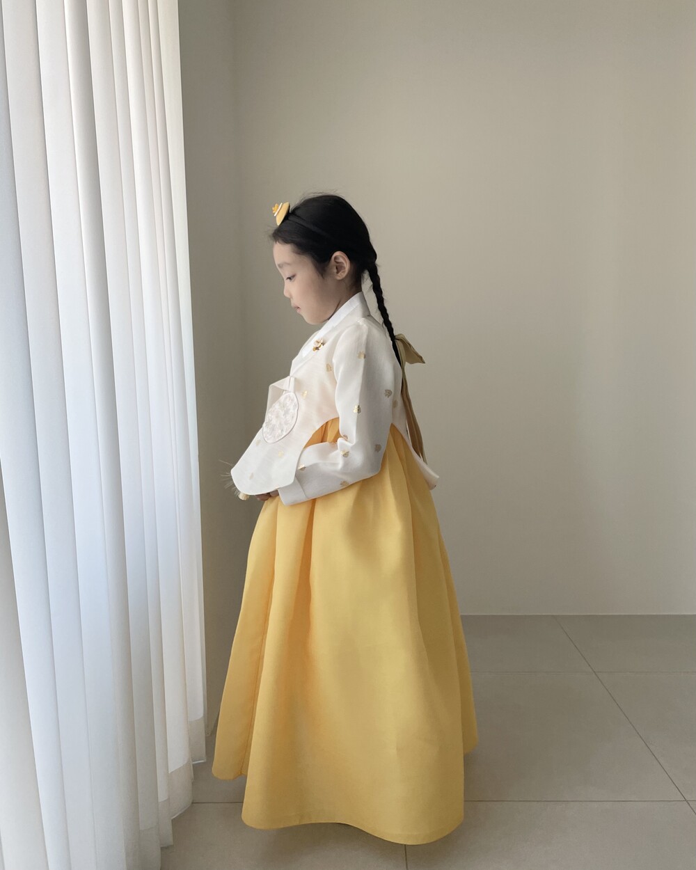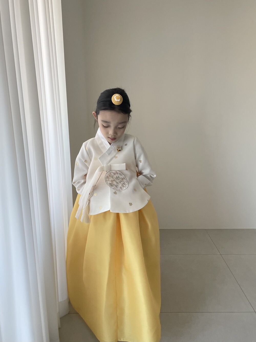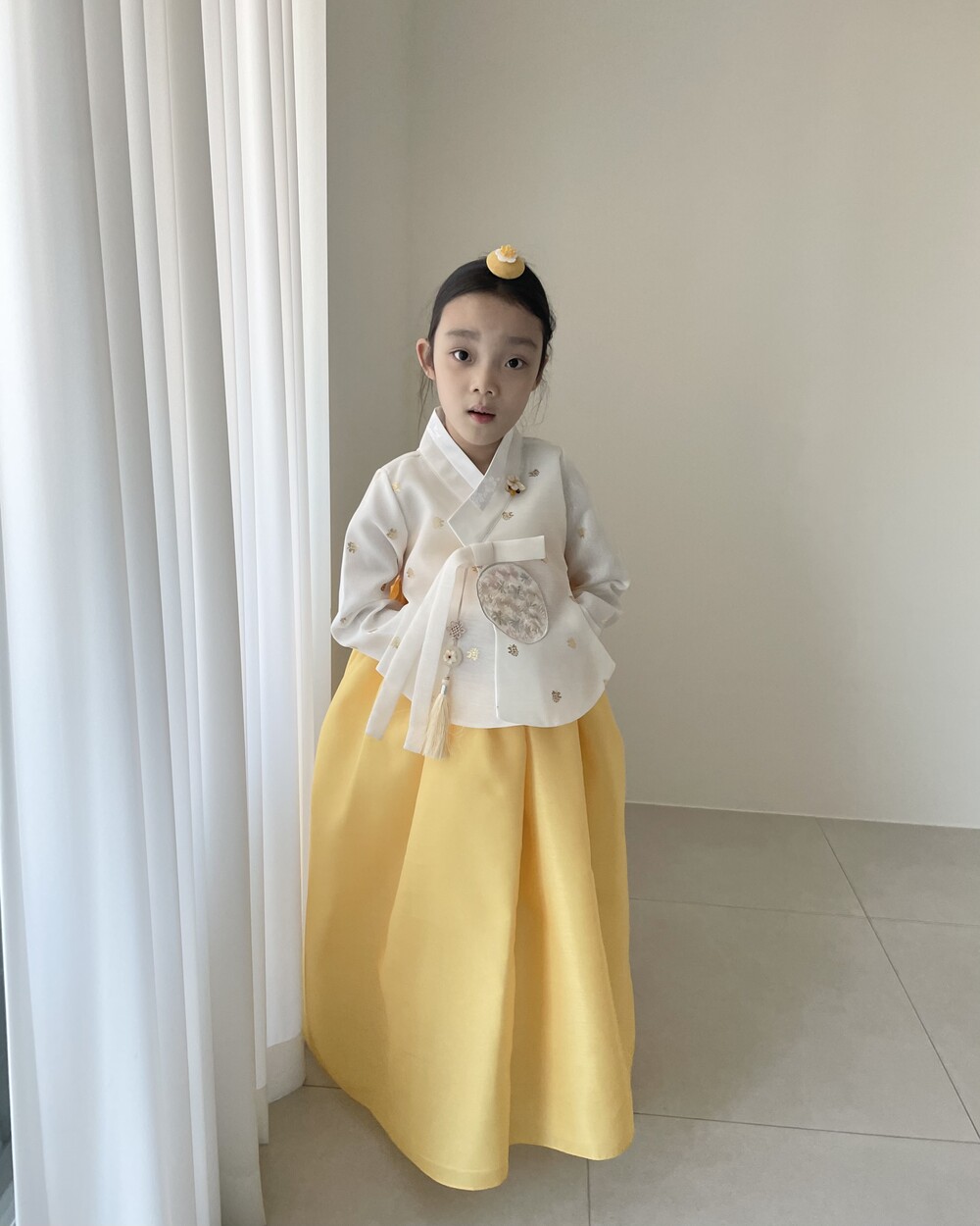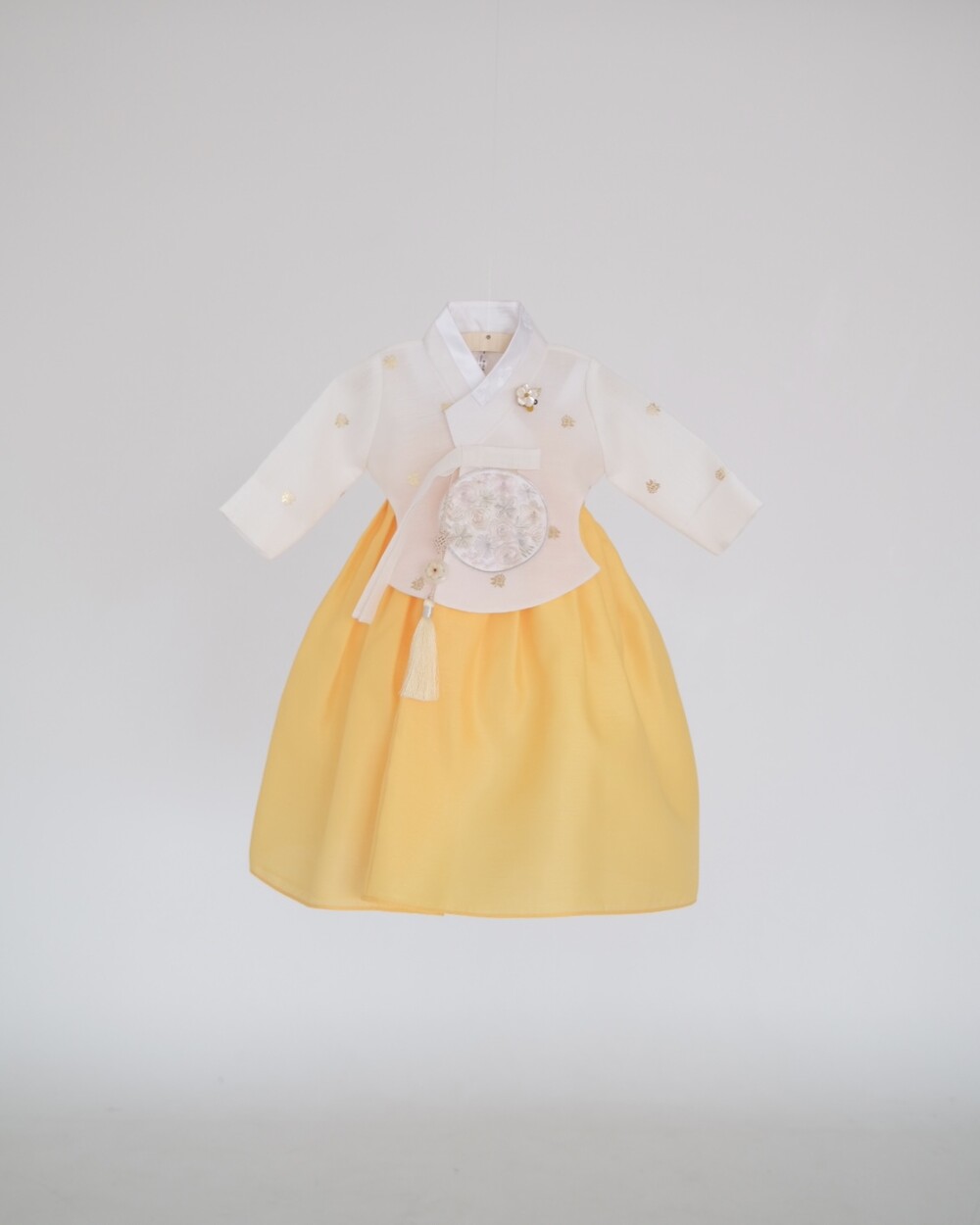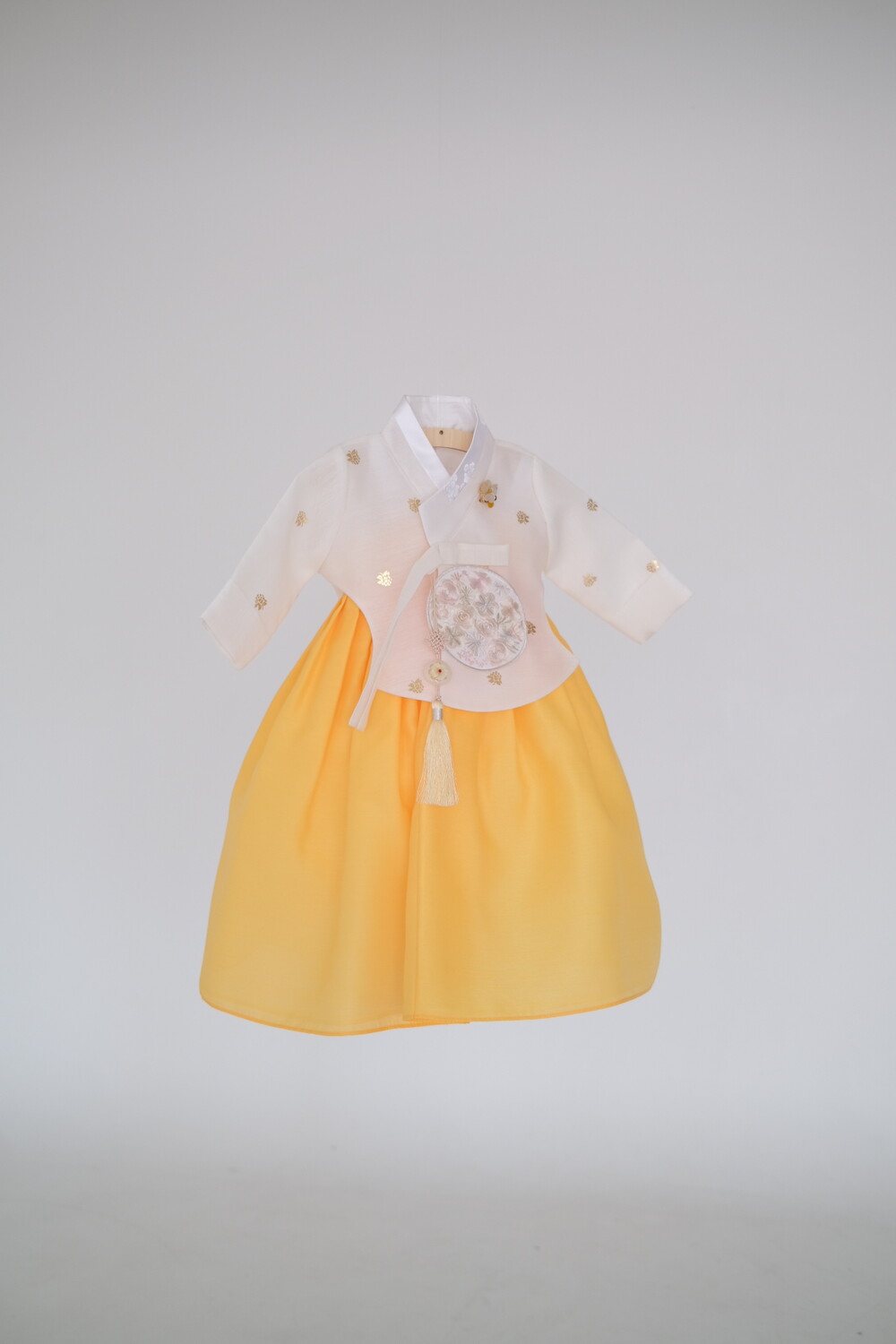 금박이 있는 흰 당의에 개나리가 연상되는 노랑치마로 구성된 한복입니다.