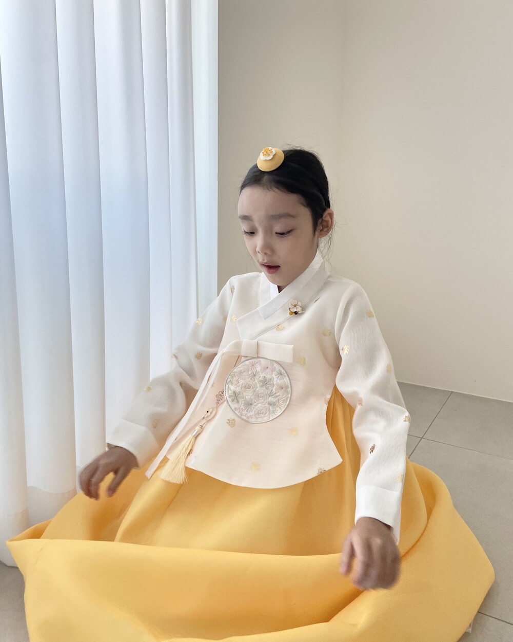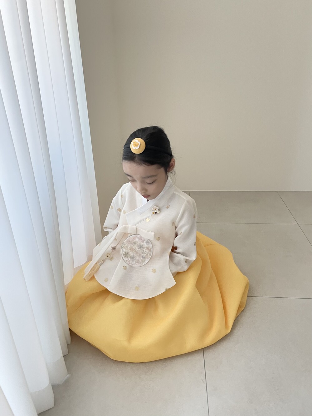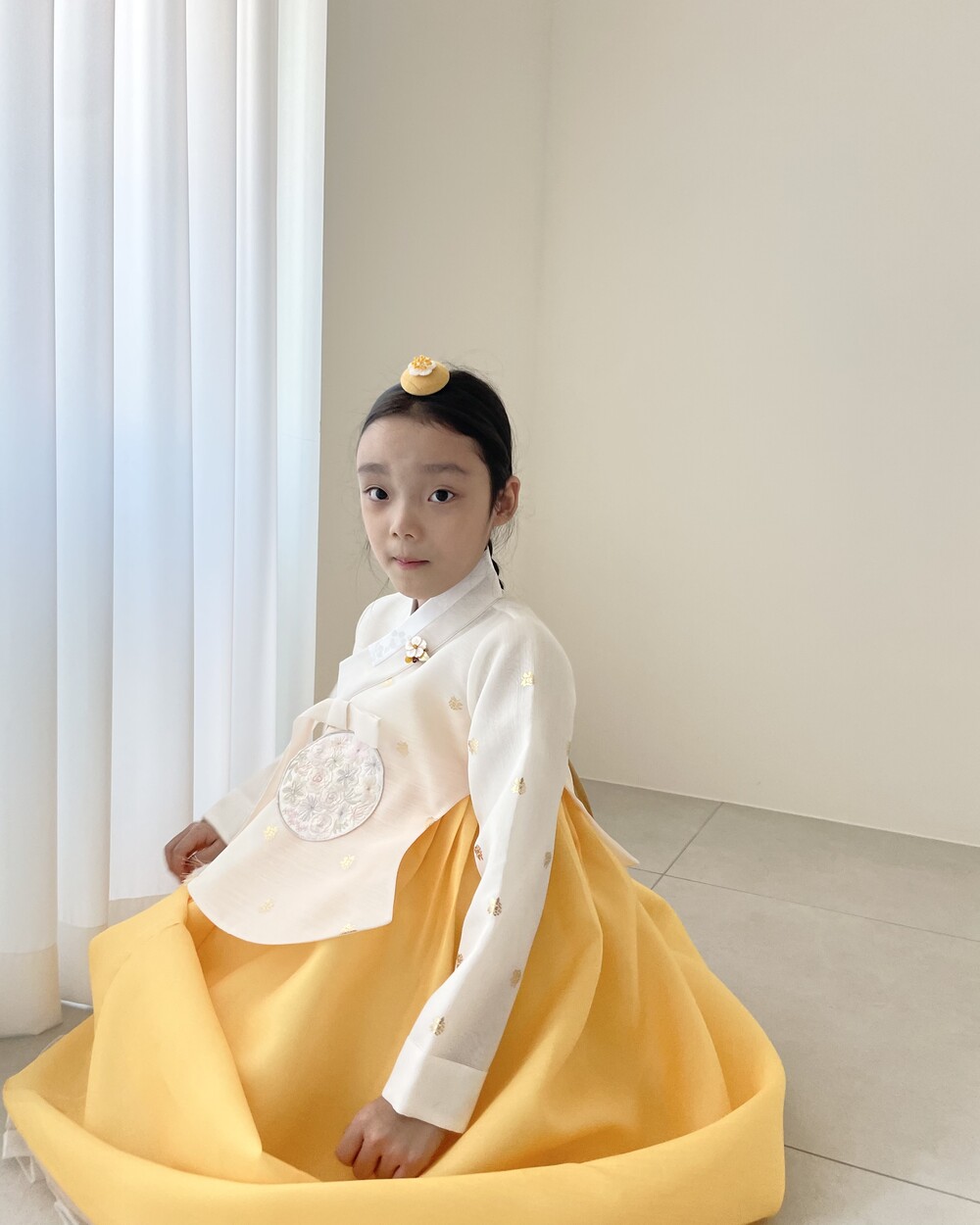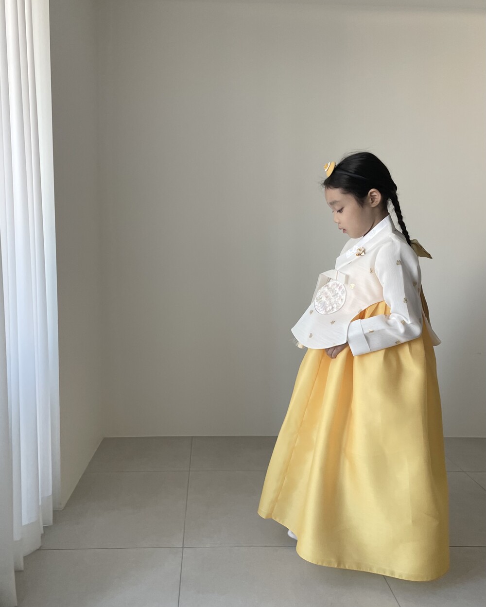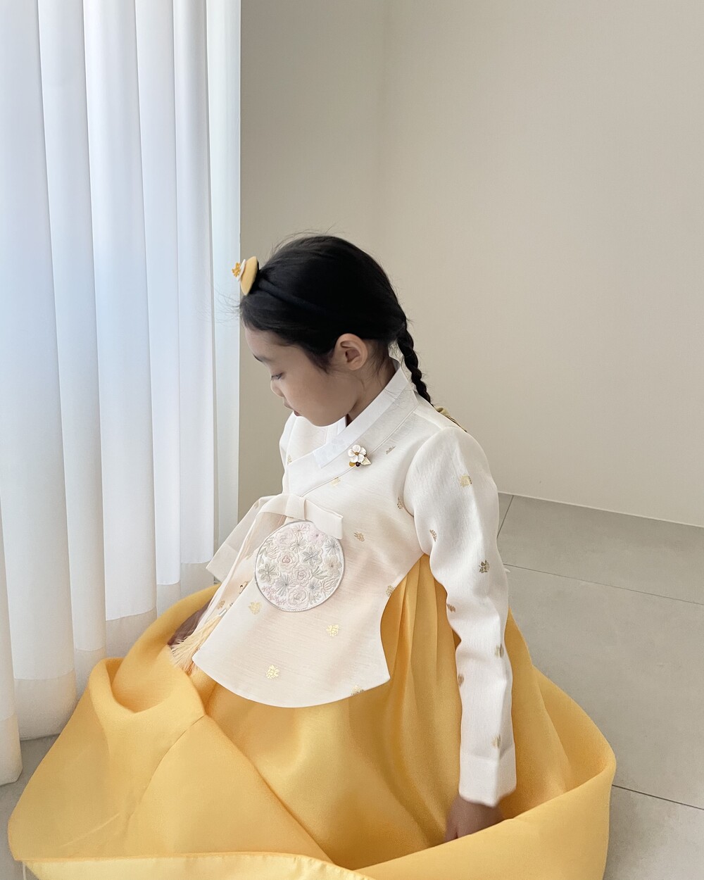 금박이 있는 흰 당의에 개나리가 연상되는 노랑치마로 구성된 한복입니다.