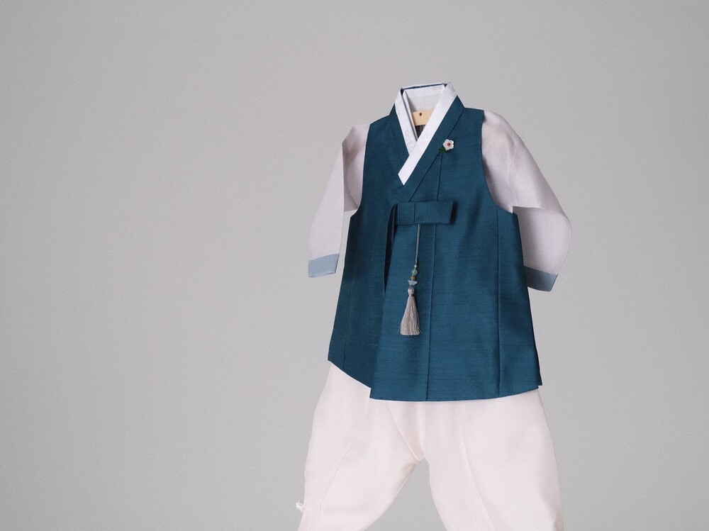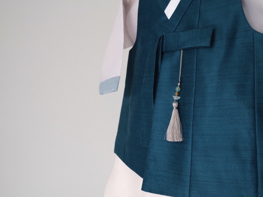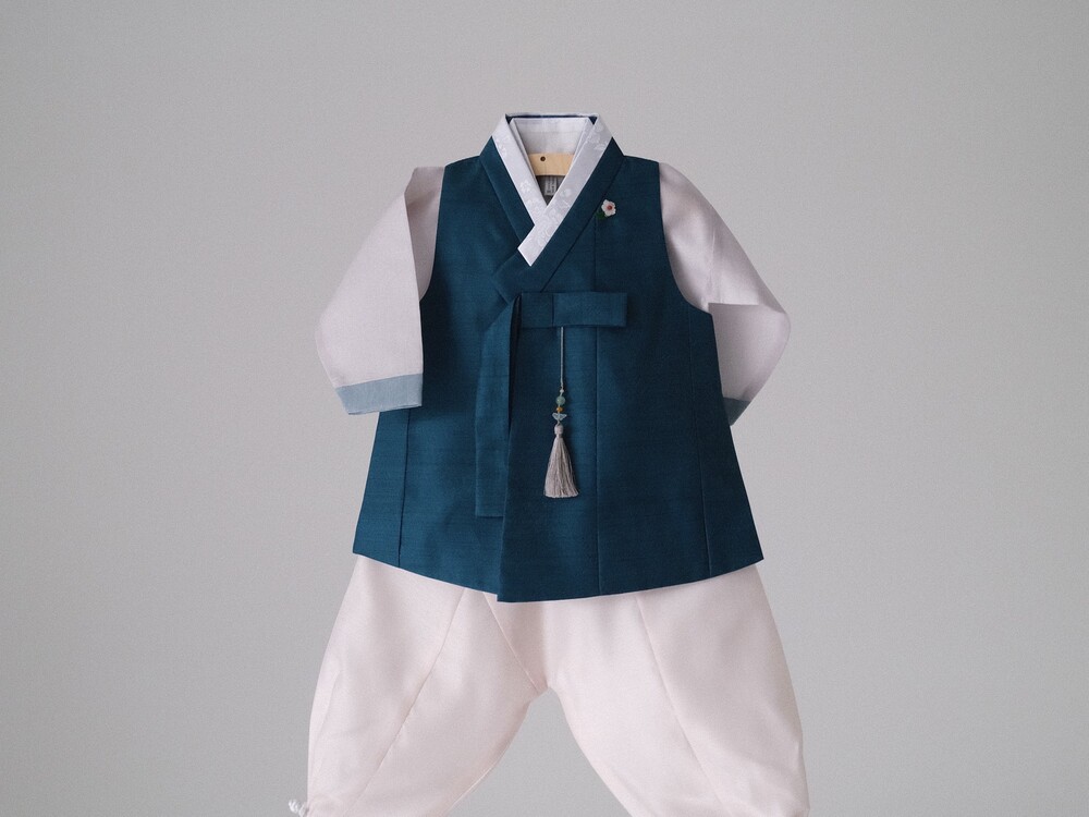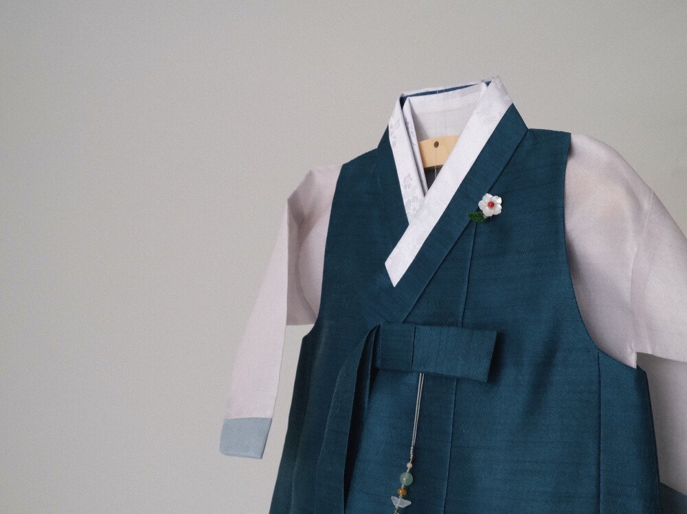 짙은 청록색 컬러가 단정하고 차분한 분위기를 만들어주는 한복입니다.