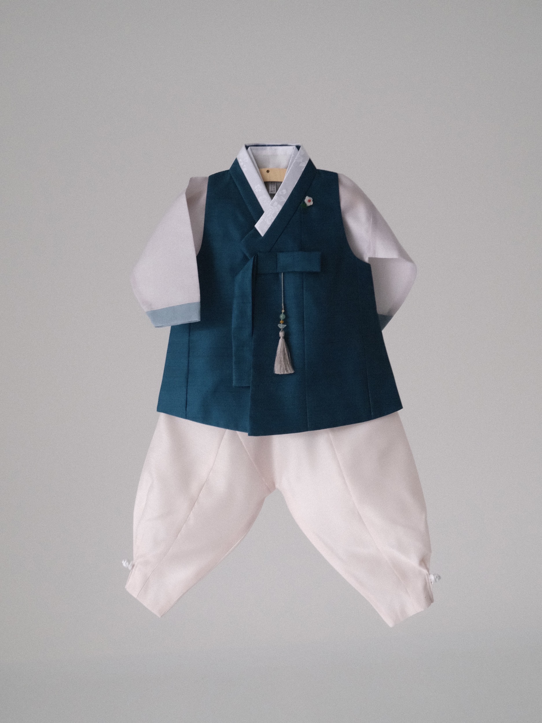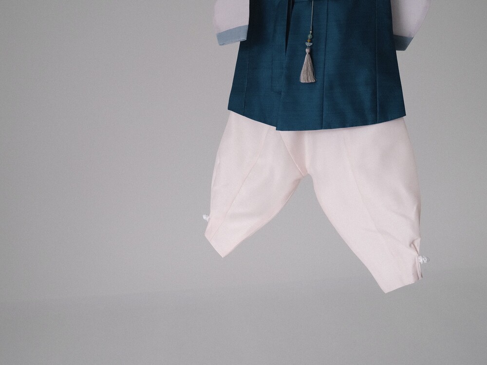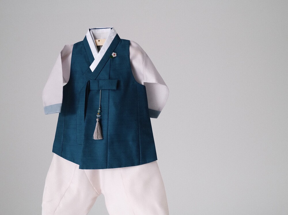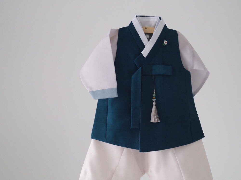 짙은 청록색 컬러가 단정하고 차분한 분위기를 만들어주는 한복입니다.