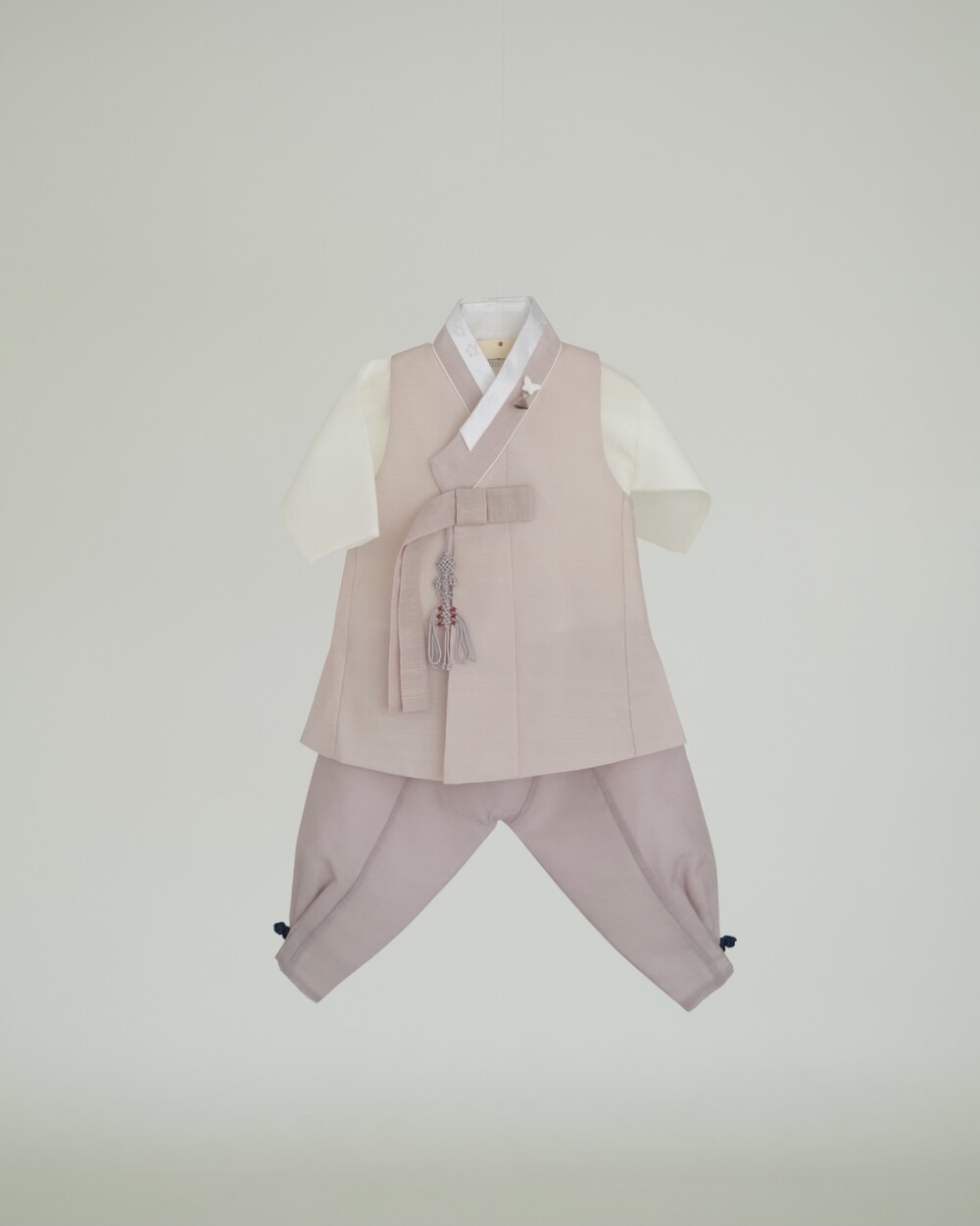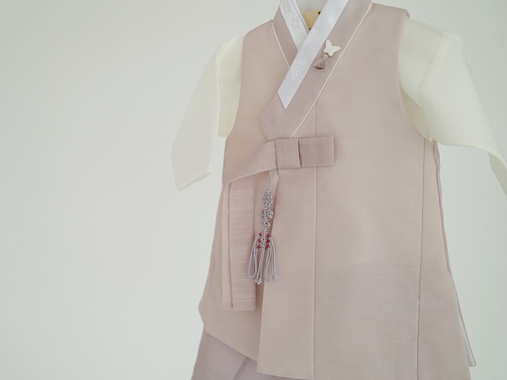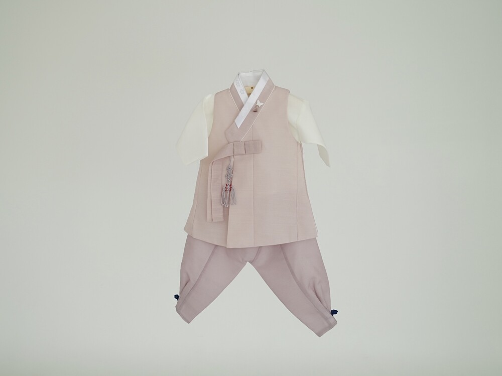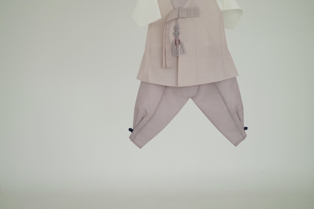 베이지 톤의 쾌자와 바지가 매치된 한복입니다.