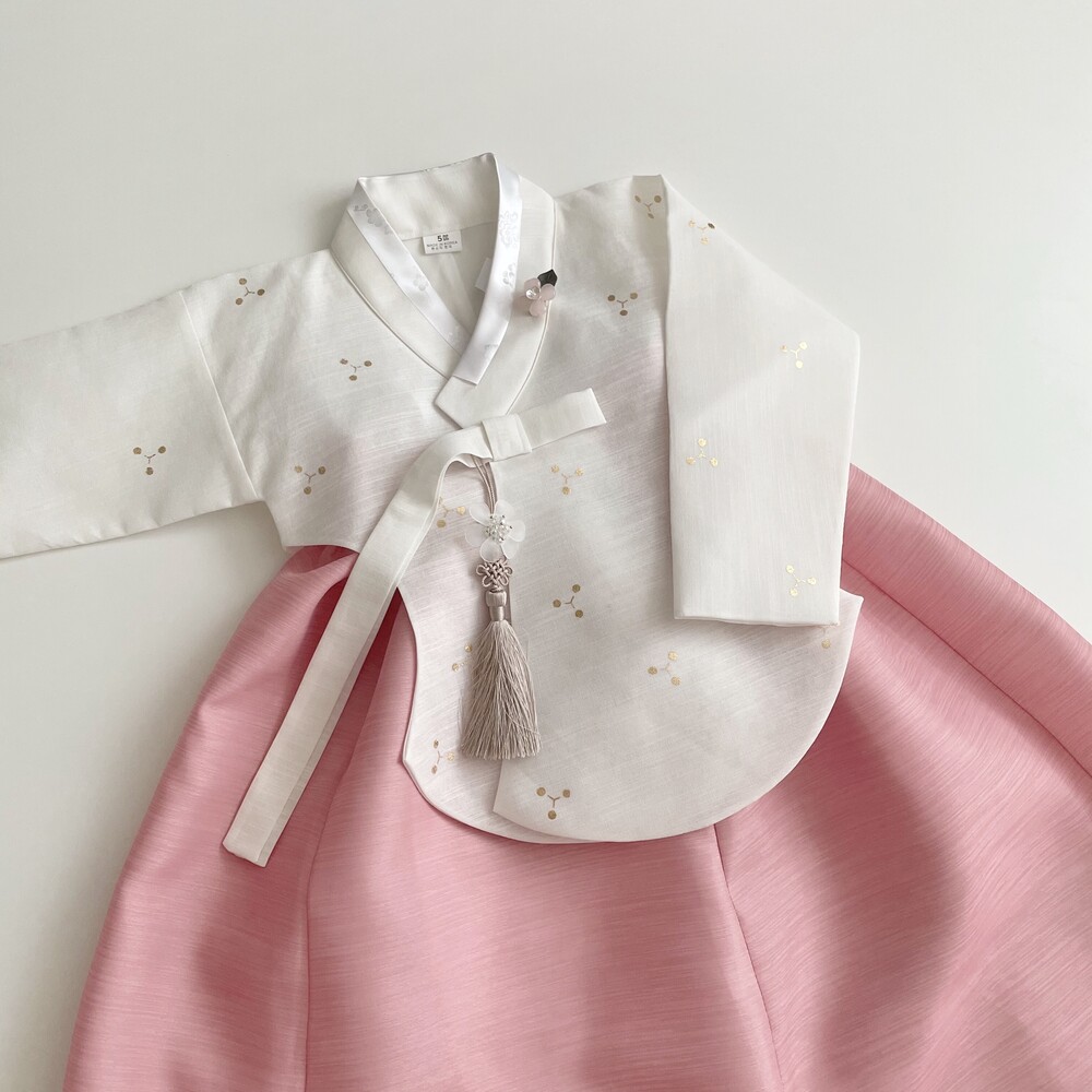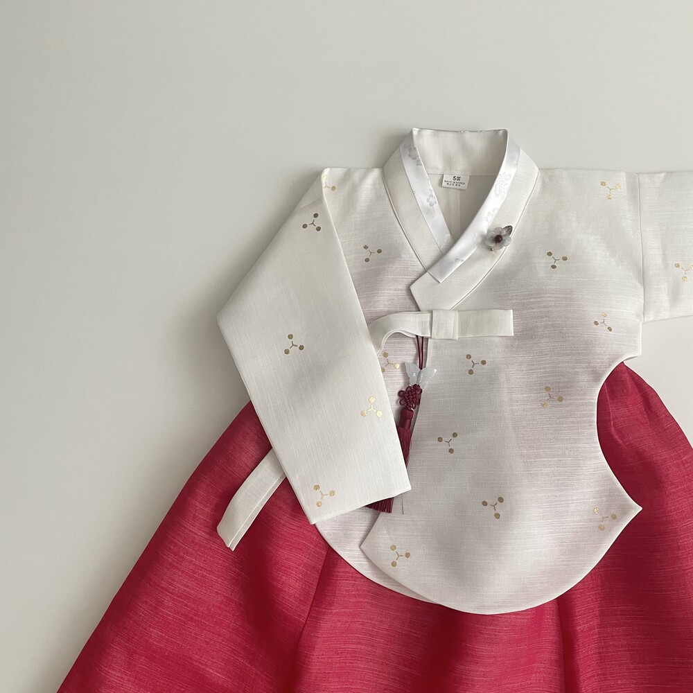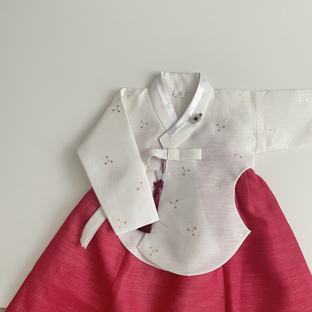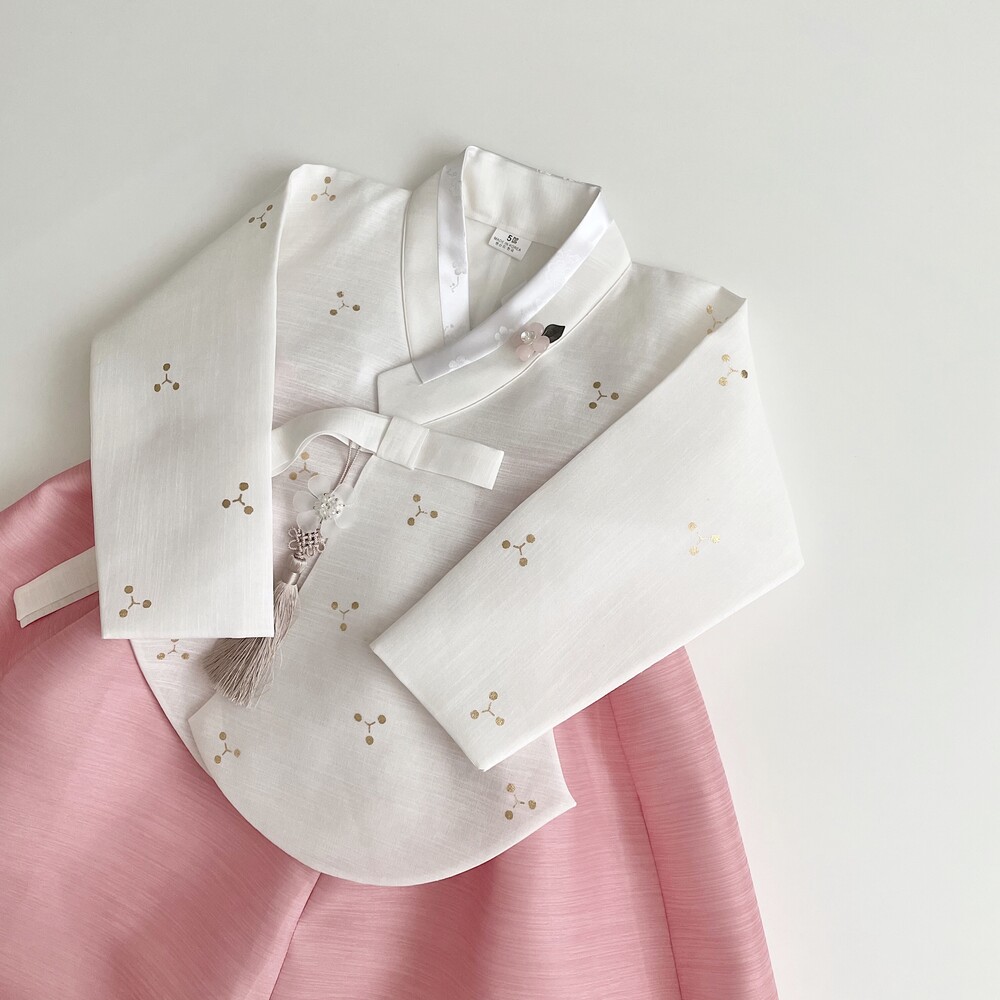 깨끗한 화이트 바탕에 작은 눈꽃같은 금박이 놓여져 있는 한복입니다.