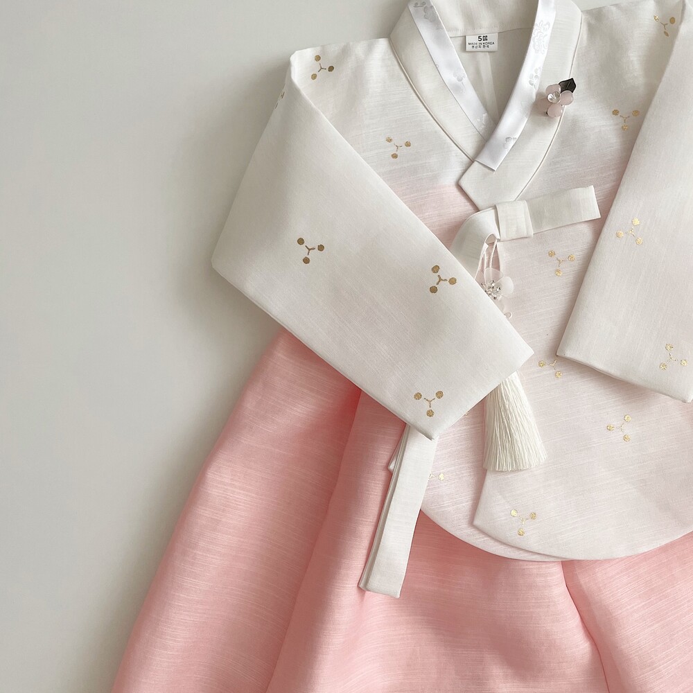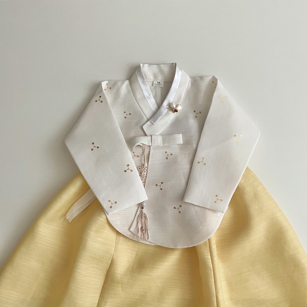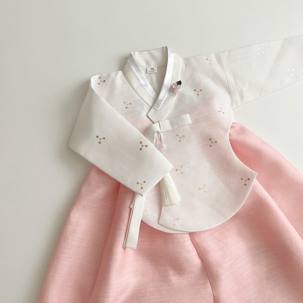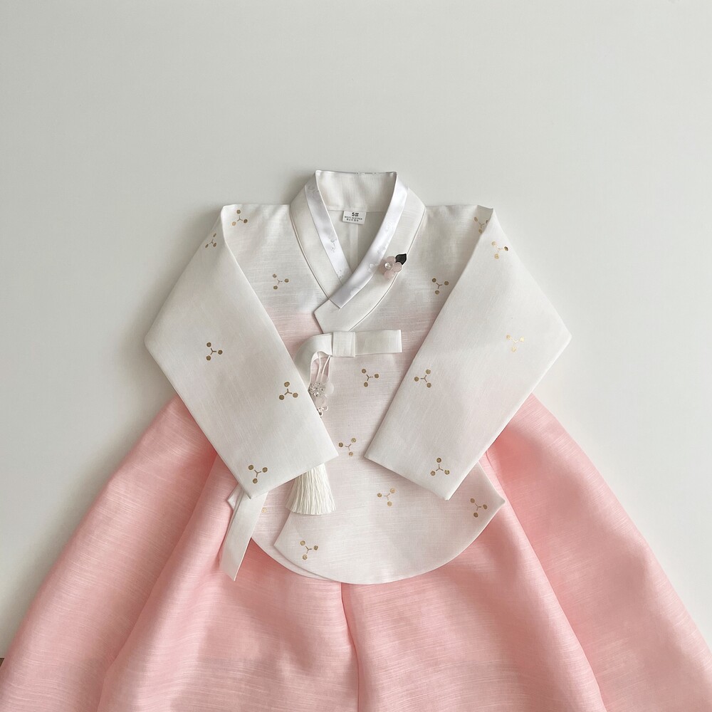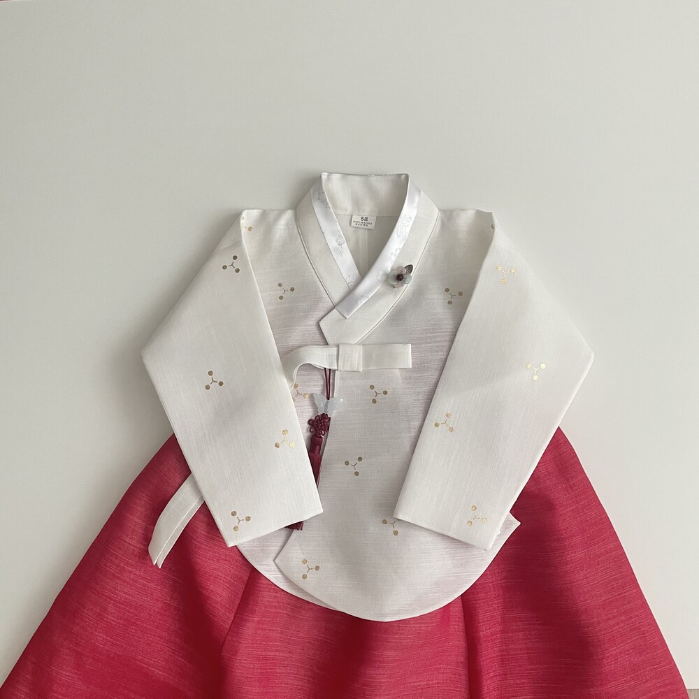 깨끗한 화이트 바탕에 작은 눈꽃같은 금박이 놓여져 있는 한복입니다.